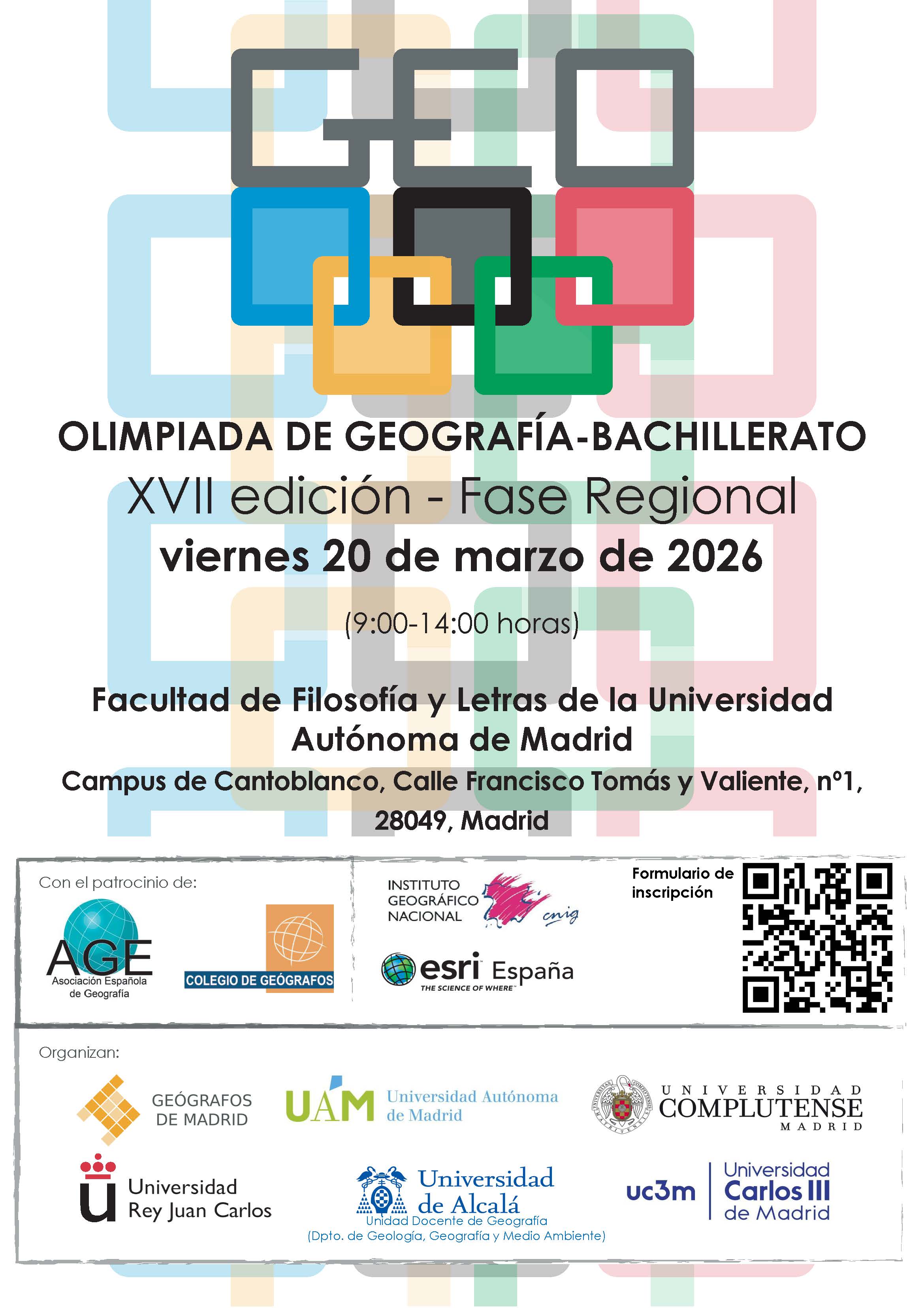 Convocatoria de la XVIIª edición de la fase regional de Madrid de la Olimpiada de Geografía, que tendrá lugar el viernes 20 de marzo de 2026, en la Facultad de Filosofía y Letras de la Universidad Autónoma de Madrid.